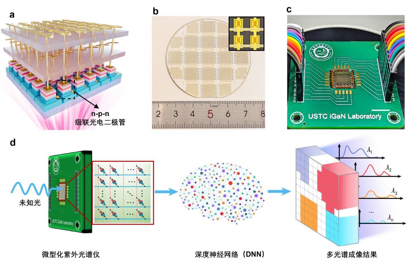 该芯片基于新型氮化镓基(GaN)级联光电二极管架构,并与深度神经网络(DNN)算法深度融合,实现了高精度光谱探测与高分辨率多光谱成像,其光谱响应速度创下了目前已报道微型光谱仪的最快世界纪录(纳秒级)。